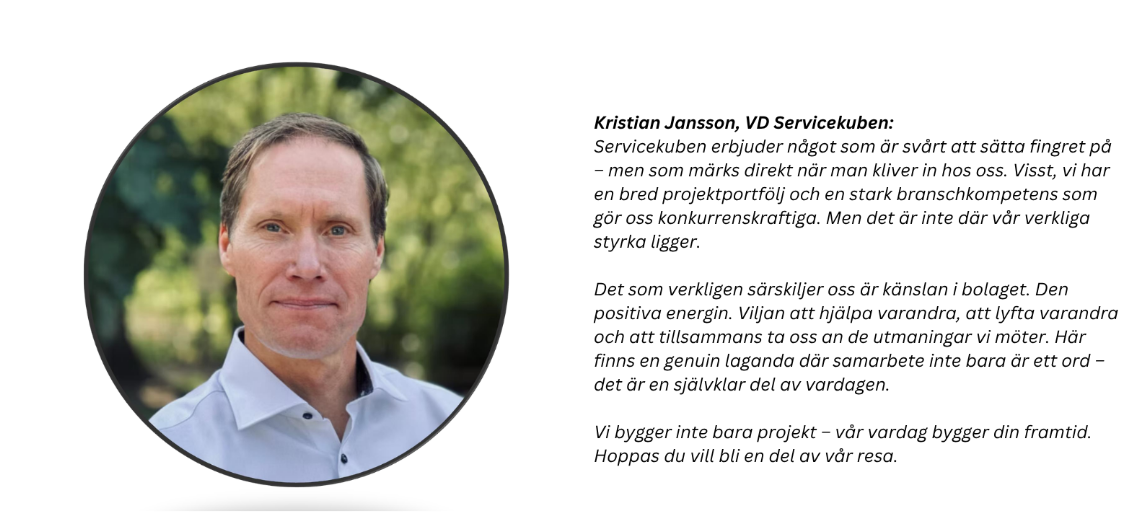 Servicekuben befinner sig på en spännande resa där stabilitet och lång erfarenhet kombineras med ett framåtblickande arbetssätt. I den här rollen blir du en viktig del av projektorganisationen, där du bidrar till att säkerställa kvalitet, ekonomi och tid i varje projekt.
